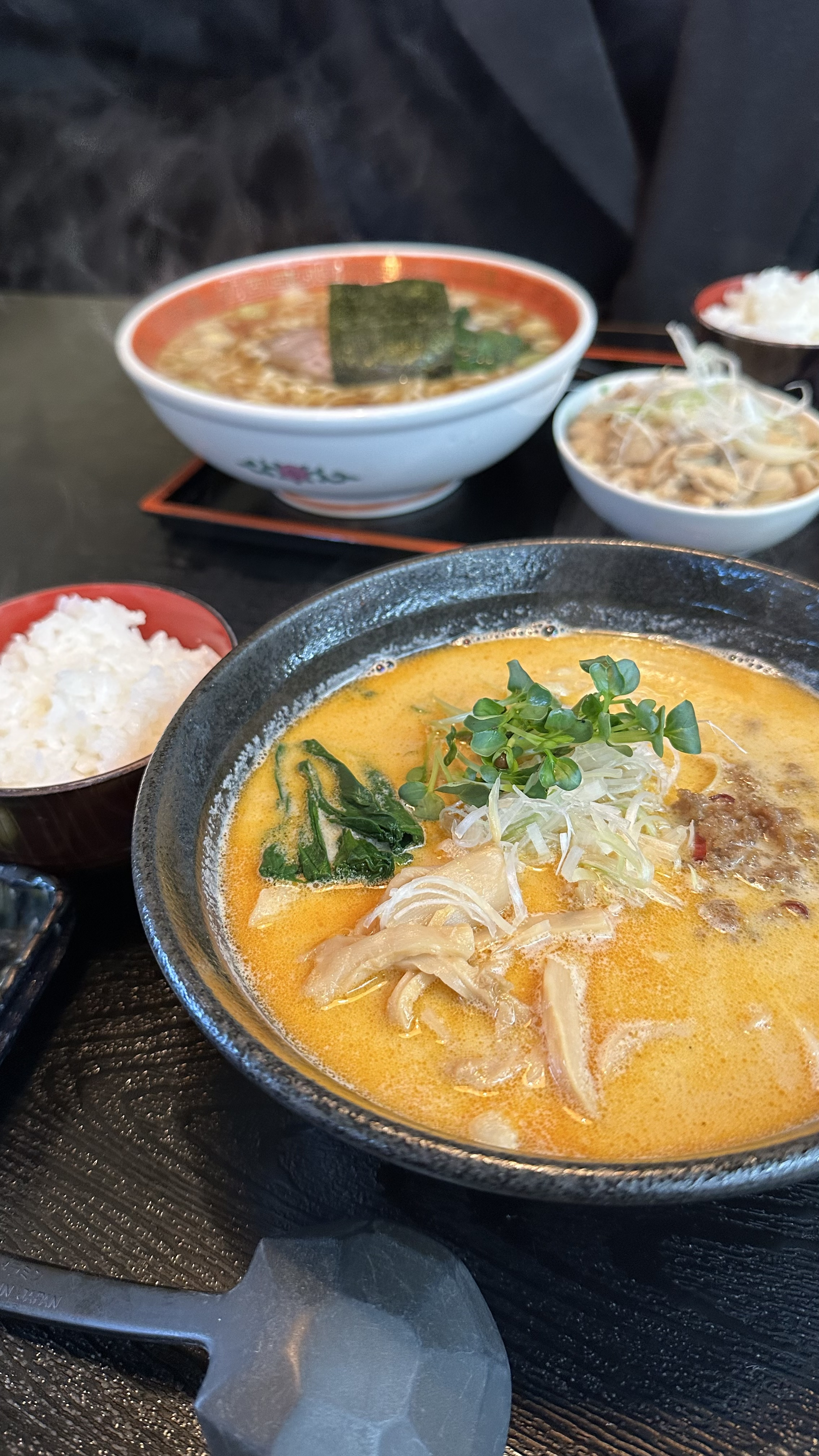 ピンボケで見えづらい奥のラーメンは