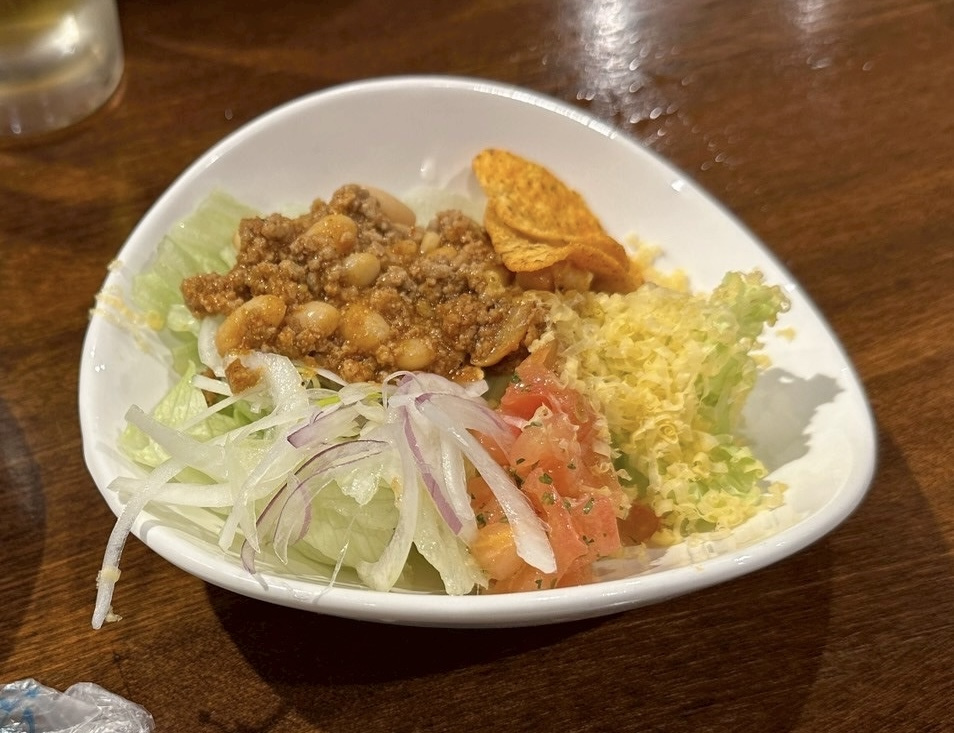 お味は少しスパイシーな豆とひき肉、お野菜とチップスが乗っていて